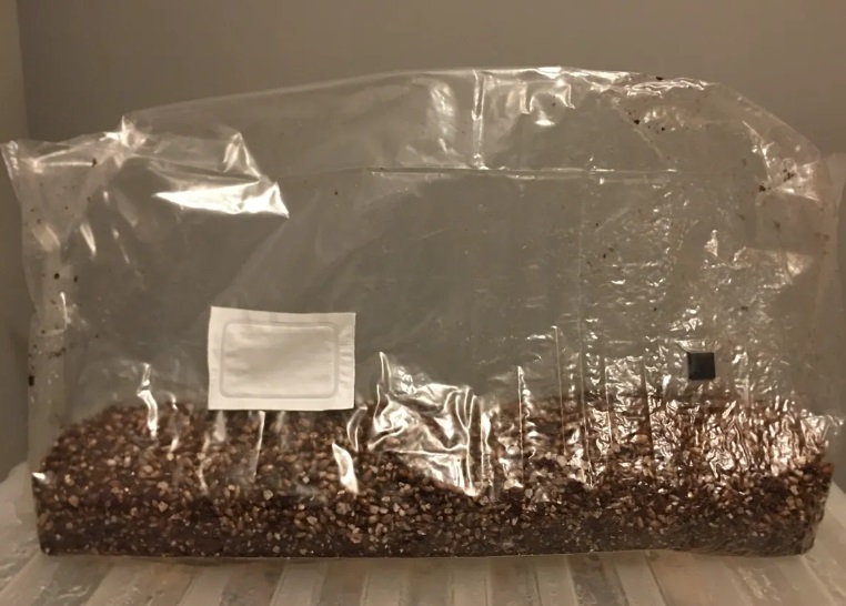 7. Incubate upright in low, indirect light. Once mycelium appears (size of a 50p coin), gently mix the bag.