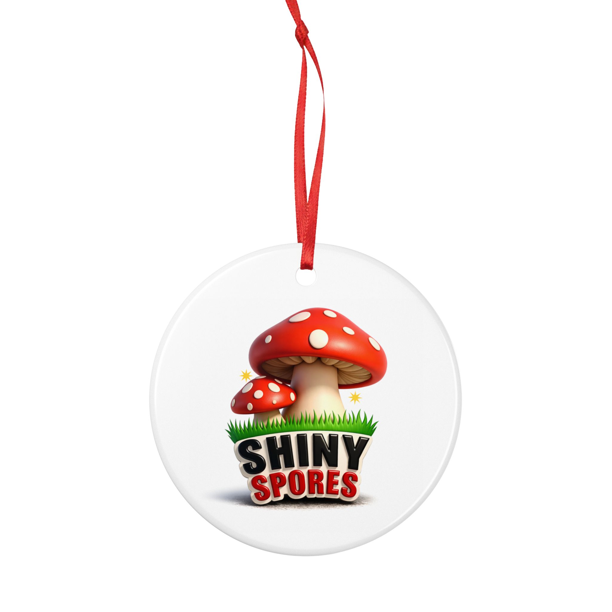A bright, whimsical ceramic ornament that brings a playful woodland vibe to holiday trees and cozy corners. The design features two red-capped mushrooms with glossy highlights and cheerful sparkles, anchored by bold, playful lettering that reads “SHINY SPORES.” Printed on both sides, the image keeps its crisp colors and cartoon charm whether the ornament faces forward or back. A vibrant red ribbon is included for easy hanging—ready to dangle from a branch, a window hook, or a gift package. It’s small but eye-catching, adding a touch of quirky personality to seasonal decor or year-round displays.